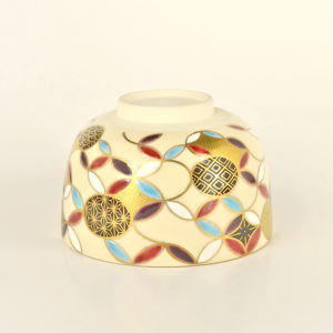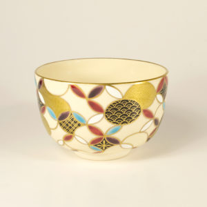 While there are many variations of this, the hallmark of the Shippo pattern is a series of overlapping circles. This bowl’s designer has put their own spin on this traditional pattern by breaking apart, filling in and merging some of the circles in the pattern. Additionally, the artist cleverly uses a variety of other classic patterns to decorate the ‘filled-in’ spaces. A simple, clear, crackle-glaze covers the entire bowl, creating the perfect backdrop for the gold-outlined vibrant enamel colors used in the decoration. It also provides a great environment for showing off the beauty of well-prepared, whisked Matcha.