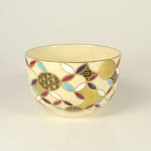 While there are many variations of this, the hallmark of the Shippo pattern is a series of overlapping circles. This bowl’s designer has put their own spin on this traditional pattern by breaking apart, filling in and merging some of the circles in the pattern. Additionally, the artist cleverly uses a variety of other classic patterns to decorate the ‘filled-in’ spaces. A simple, clear, crackle-glaze covers the entire bowl, creating the perfect backdrop for the gold-outlined vibrant enamel colors used in the decoration. It also provides a great environment for showing off the beauty of well-prepared, whisked Matcha.