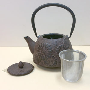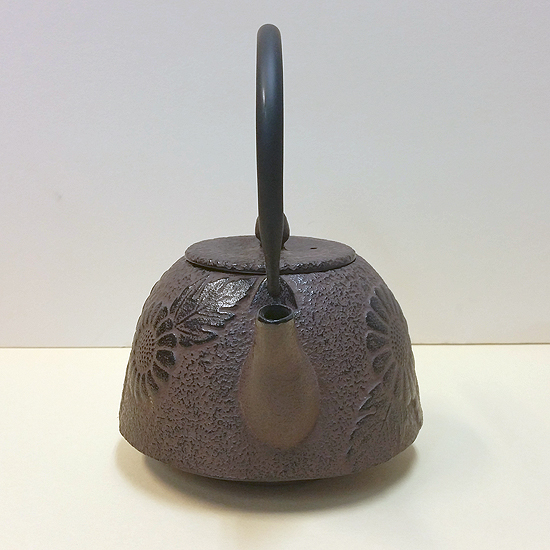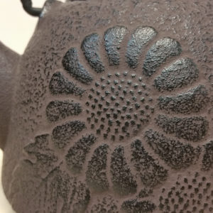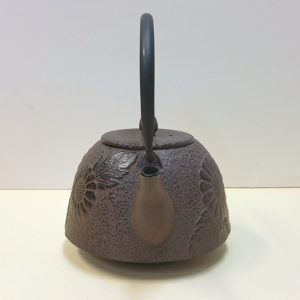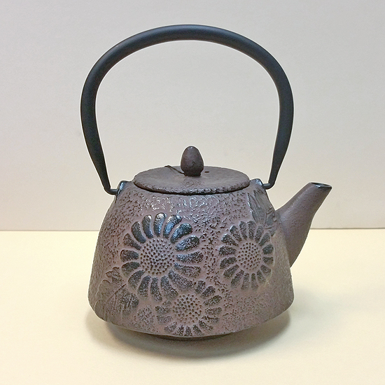 This is a classically shaped cast iron teapot painted in soft brown / black color. It is elegant without being flashy or ostentatious – but it certainly makes a statement! Three large chrysanthemum blossoms adorn each side of the pot. Chrysanthemums are the symbol of the Japanese Emperor and court and are a beloved flower in both Japan and China.