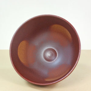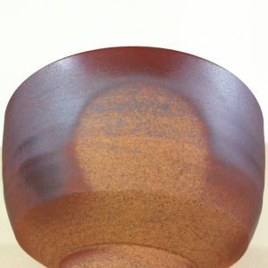 The burnt sienna hue that decorates the bowl has a nice soft sheen. Portions of the bowl have been left unglazed, allowing lovely mottled orange with dark fleck-colored clay to take center stage. There are three arch patches on both the bowl’s interior and exterior that roughly ‘line-up’ with one another, creating a nice visual when one views the bowl from an angle. The bowl has a pleasant sueded feel in the hand, with the unglazed portions being slightly more textured. The weight is substantial, without feeling heavy. It has a nice footring and is raised just high enough to allow you to slide your fingers under the bowl when you pick it up.