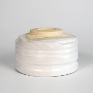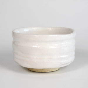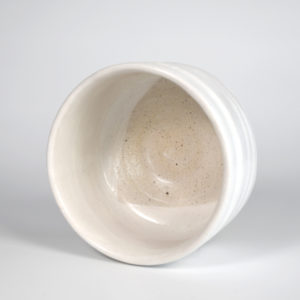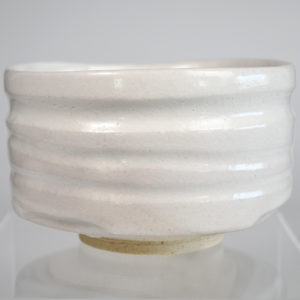 This is a substantial matcha bowl that is pleasantly simple and straightforward in both its design and glazing. Several grooves of varying widths on the bowl’s straight exterior wall add a nice decorative touch, and also make the bowl easier to hold. The thick, cool white glaze that covers the majority of the bowl has some wonderful crazing and pinholes. A triangular patch of the clay’s natural cream with dark fleck color (which is coated by a clear glaze) is wonderfully displayed on the bowl’s interior. This lovely bowl looks especially beautiful once filled with the frothy green of matcha.