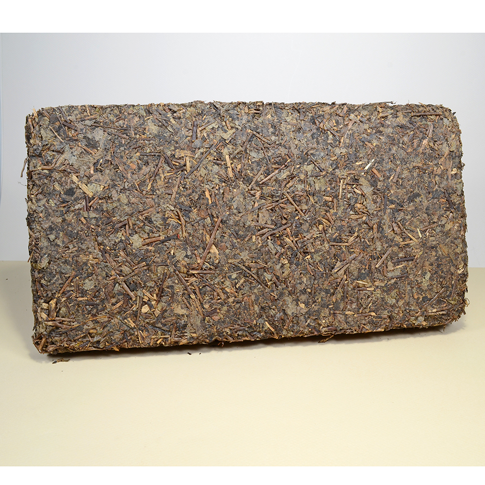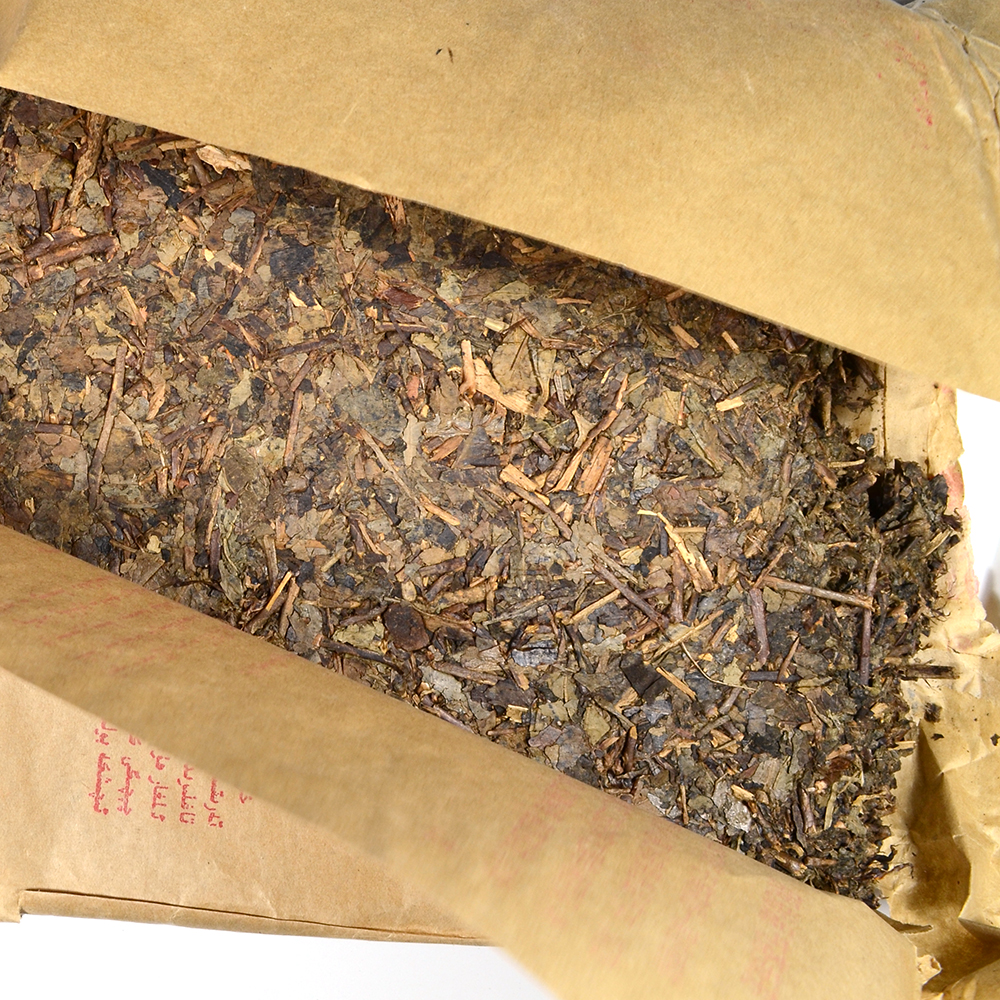 The leaf is thick and mixed russet browns in color and is irregular in appearance. After firing, the leaf is packed in large bamboo baskets and stored in aging rooms with natural ventilation that allows the tea to continue to breathe and change. When the tea is ready to sell, it is repacked into smaller bamboo baskets or into paper boxes. Our Fu Zhuan was packed into 1 or 2 kilo bricks, depending on the preference of the tea producer. We break up these bricks as we receive orders for the loose leaf tea.