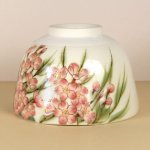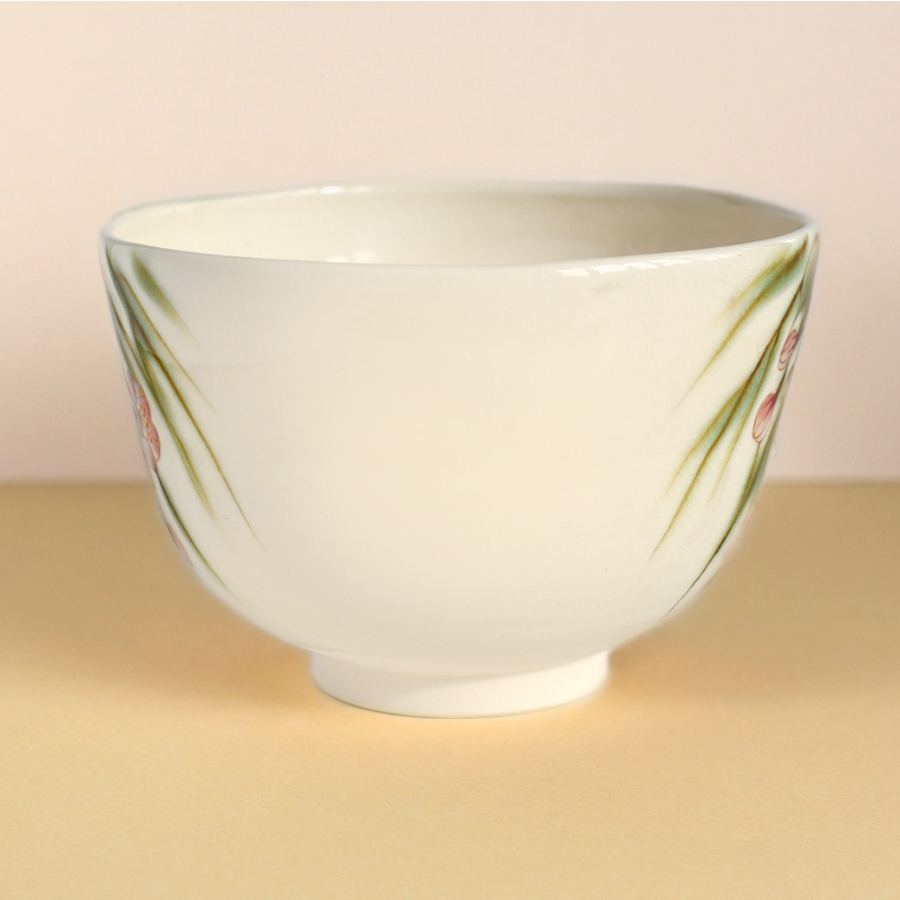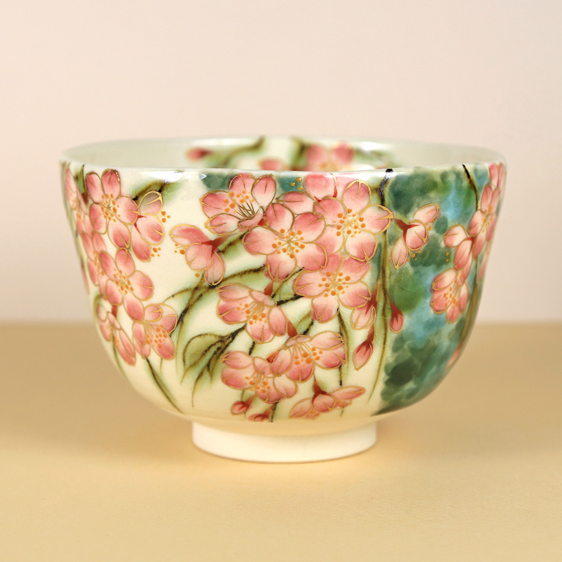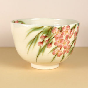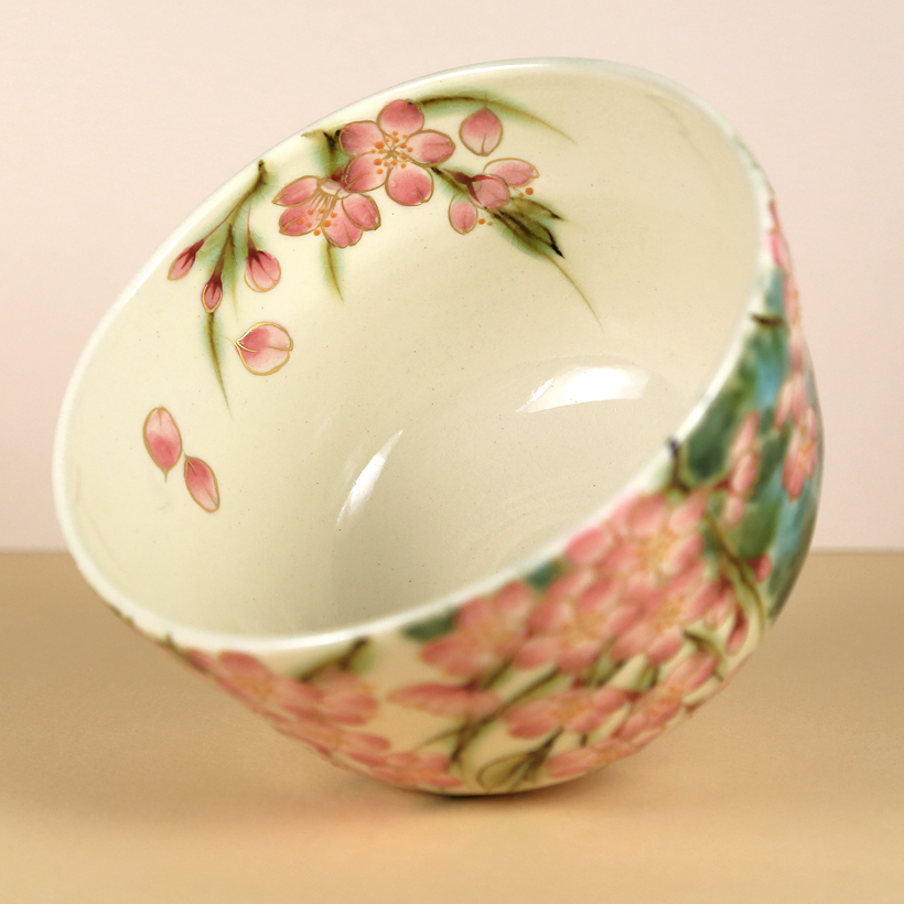 On the inside of the bowl there is another blossoming branch along with several errant petals, giving the sense a gentle breeze is blowing through. This interior detail looks especially pleasing when the bowl is filled with frothy green matcha.
