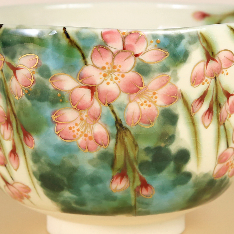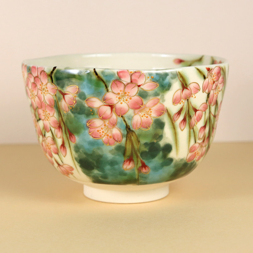 This Kiyomizuyaki matcha bowl is simply stunning! With its color gradation and the translucent quality, the decoration has the look of a fine watercolor painting. The willowy, blossom-laden branches of a Shidarezakura (weeping cherry tree) are exquisitely rendered and the design has a wonderful sense of both depth and movement. Each soft pink cherry blossom is expertly outlined in gold, with the opened blossoms featuring multiple dots of orange glaze at their centers. The orange glaze dots are raised, providing a small touch of texture to the the bowl’s otherwise perfectly-smooth surface. Along with the gold accents, this really brings the flowers to the forefront. For the tree branches, the artist cleverly uses a glaze that bleeds during firing. This bleeding effect softens the lines, making them less prominent while conveying a sense of motion.