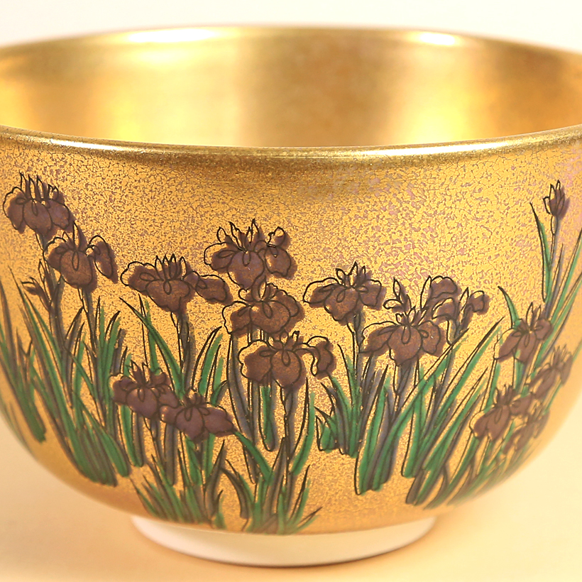 The bowl prominently features both front and back a display of Japanese iris (Iris laevigata or rabbit-ear iris ) inspired by the works of Ogata Kōrin (尾形光琳?, 1658 – June 2, 1716). Ogata, a member of the Rinpa School style of painting, often depicted groupings of blue-purple iris in a natural setting on decorative folding screens. His screens are classified as National Treasures in Japan.