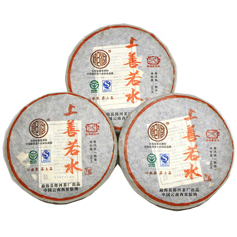 This beeng cha was made by the Menghai Langhe Tea factory from high quality materials (1st, 3rd and 5th grade leaf) gathered and fermented in 2008 and pressed in 2009. The raw materials came from an ecological tea garden and the cake is a tribute to the environment: mountain and river.