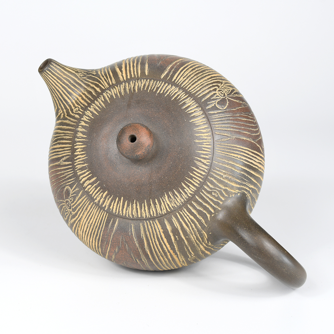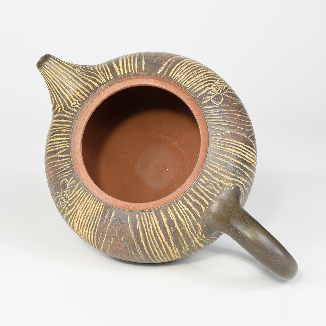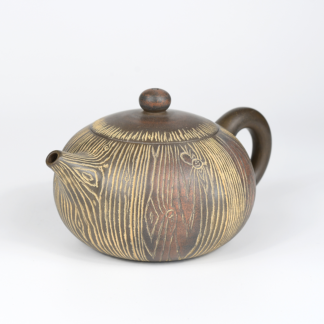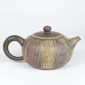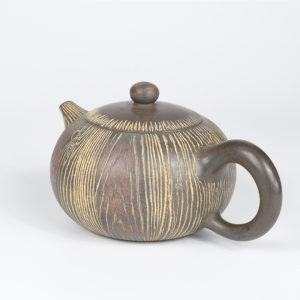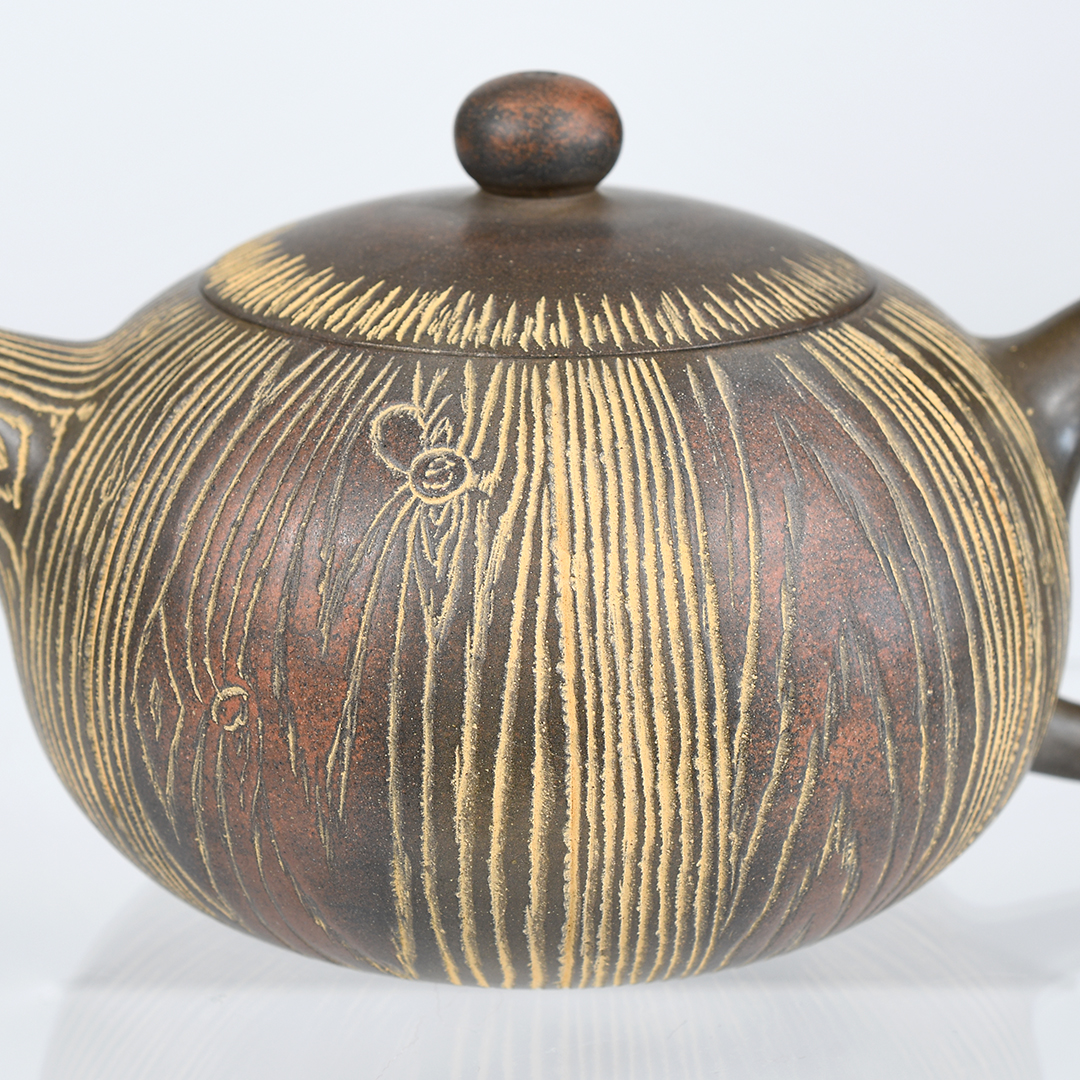An eye-catching wood-grain pattern is carved into the body, spout and lid of this handsome Nixing teapot. The strong vertical lines in the design accentuate the pot’s rounded body and its gracefully-elongated spout. Patches of dark and reddish-brown color float across the pot, giving it an antiqued look. Its surface is smoothly-polished and has a soft sheen. The handle is generously-sized and easy-to-hold.