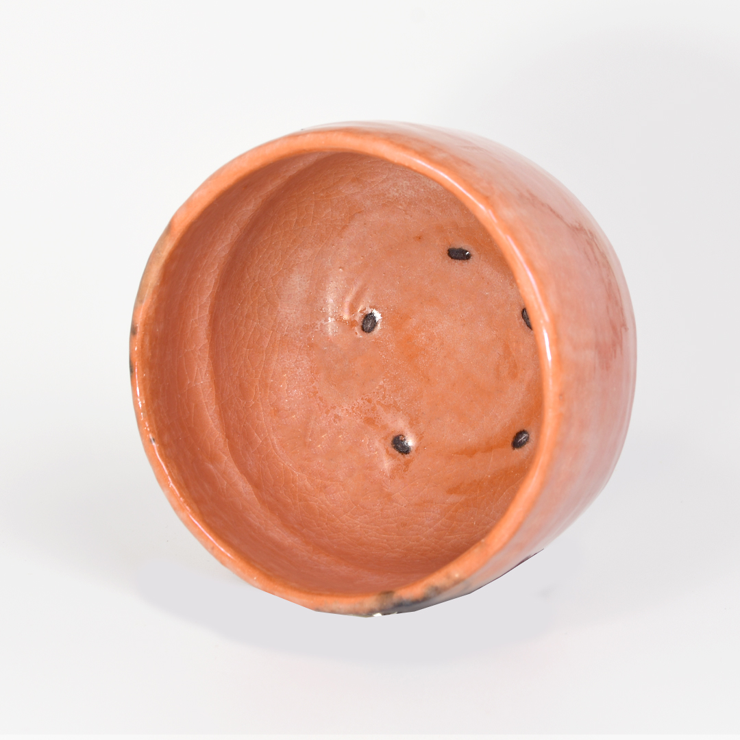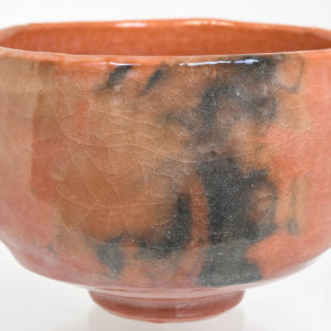 This bowl is a classic Aka-raku (red color) Matcha bowl. Its generosity of size and understated elegance is stylish yet restrained. Despite its size, the weight of the bowl is light and soft in the hand. Random color patches of grey float on the front of the bowl like clouds shaped by a gentle breeze. The combination of colors is restful, pretty and non-cluttered. This bowl will set a happy tone when drinking Matcha outdoors on a cool summer’s evening.