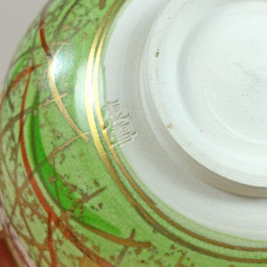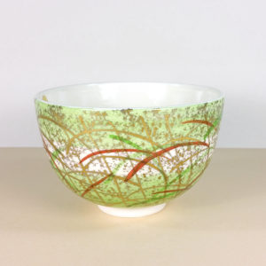 Splashes of gold fleck tie the design all together to give this tea bowl a very gay and spirited feeling. The ivory color in side of the bowl is the perfect foil for the vivid green of Matcha. The mark of the potter is clearly impressed on the base of the bowl.