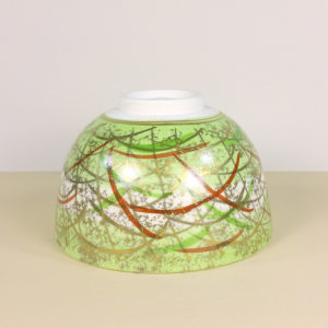 This chawan pulses with energy and spring emotion. Vivid slashes of red, gold and tea green punctuate a background that features light green bands of wash that have been applied with a delicate hand above and below a middle band of ivory.