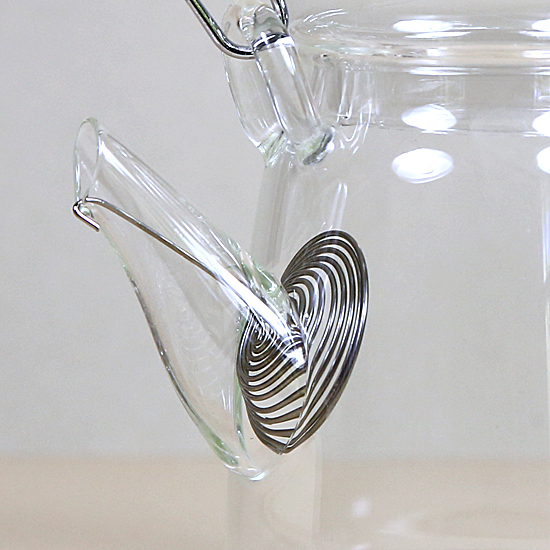 It has a stainless steel handle and a coiled stainless steel strainer attached to the spout (which is removable for emptying and cleaning).
