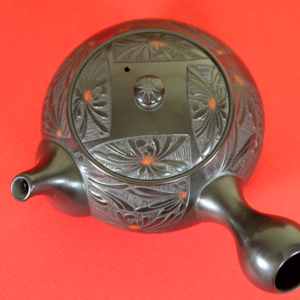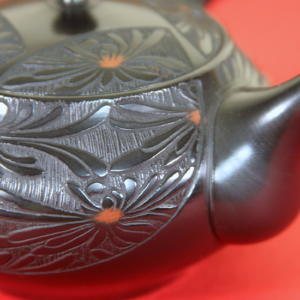 The intricate carvings on the body and lid of the teapot are executed within 4 delineated panels. Inside each panel are renderings of slightly elongated chrysanthemum blossoms. These polished blossoms float above a background that is composed of painstakingly carved fine, thin lines. A red dot of color forms the center of each blossom and adds an elegant yet restrained ‘pop’ of color. This duality of black and red is achieved by controlled, multiple firings in the kiln.