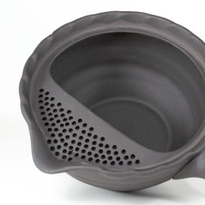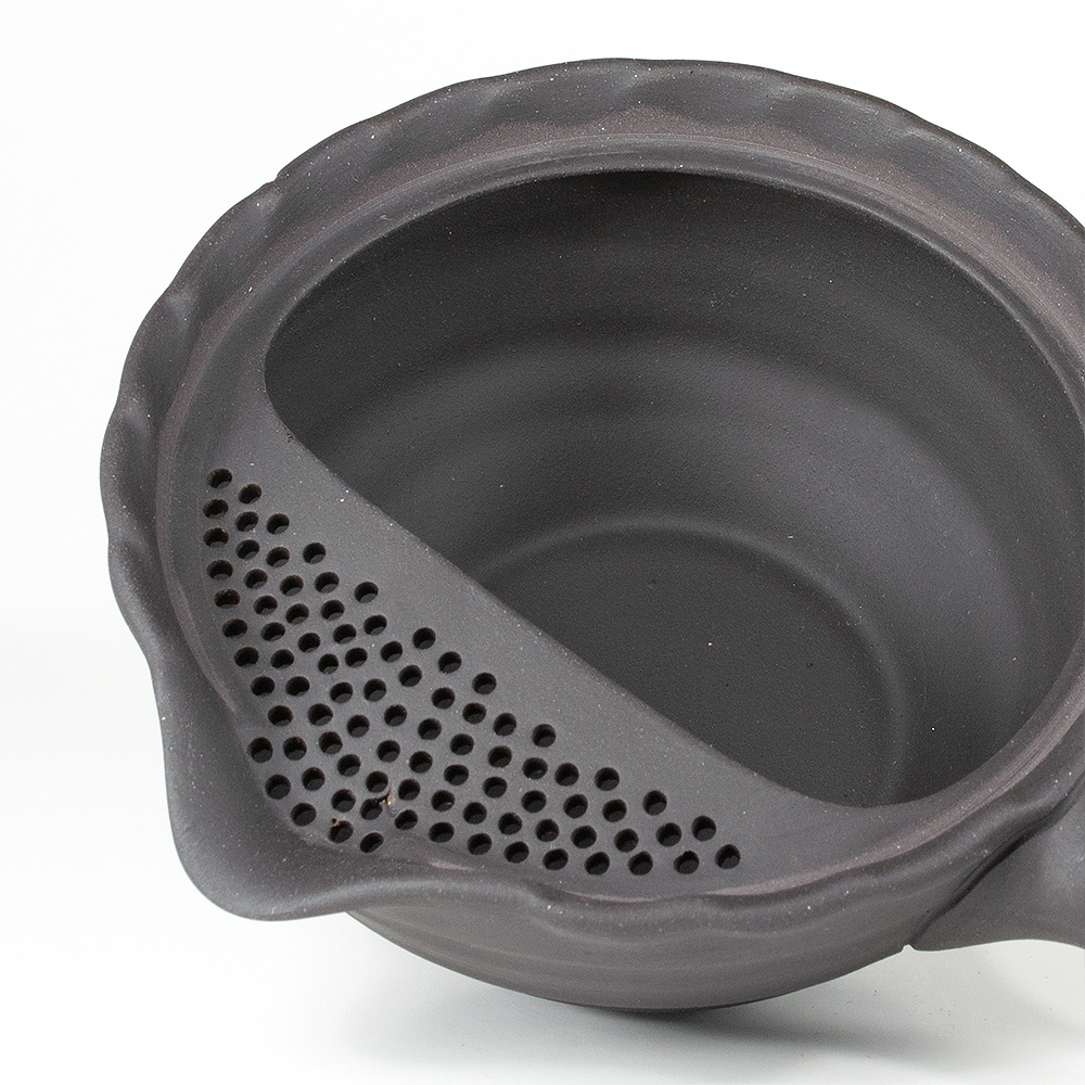 The pot has a unique 88 hole strainer and open spout giving it a very quick pour, similar to a houhin. The lid fits securely in the pot and sits atop the back of the filter, assuring that no leaf will bypass the filter. Its side handle is well proportioned and easy to grasp and pour with, leaving one’s left hand available to press the lid.