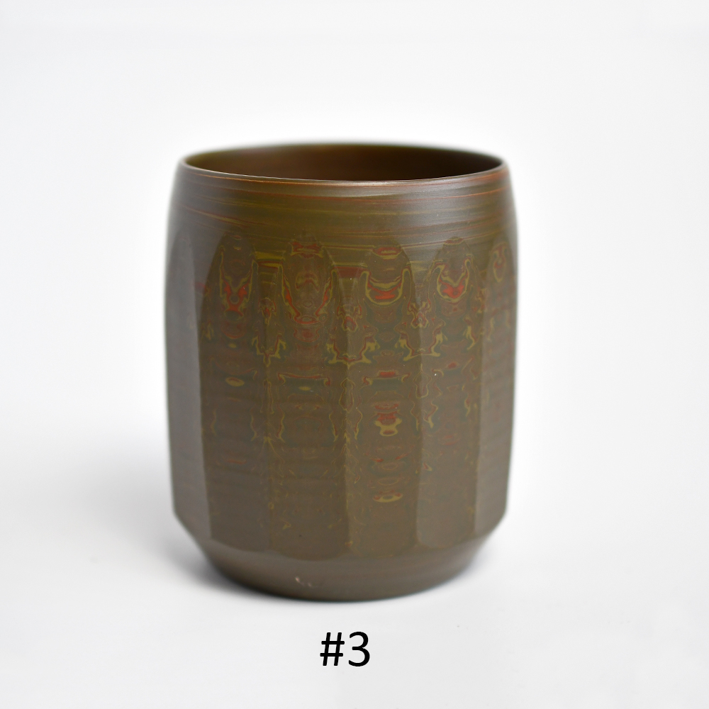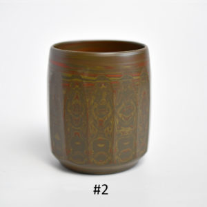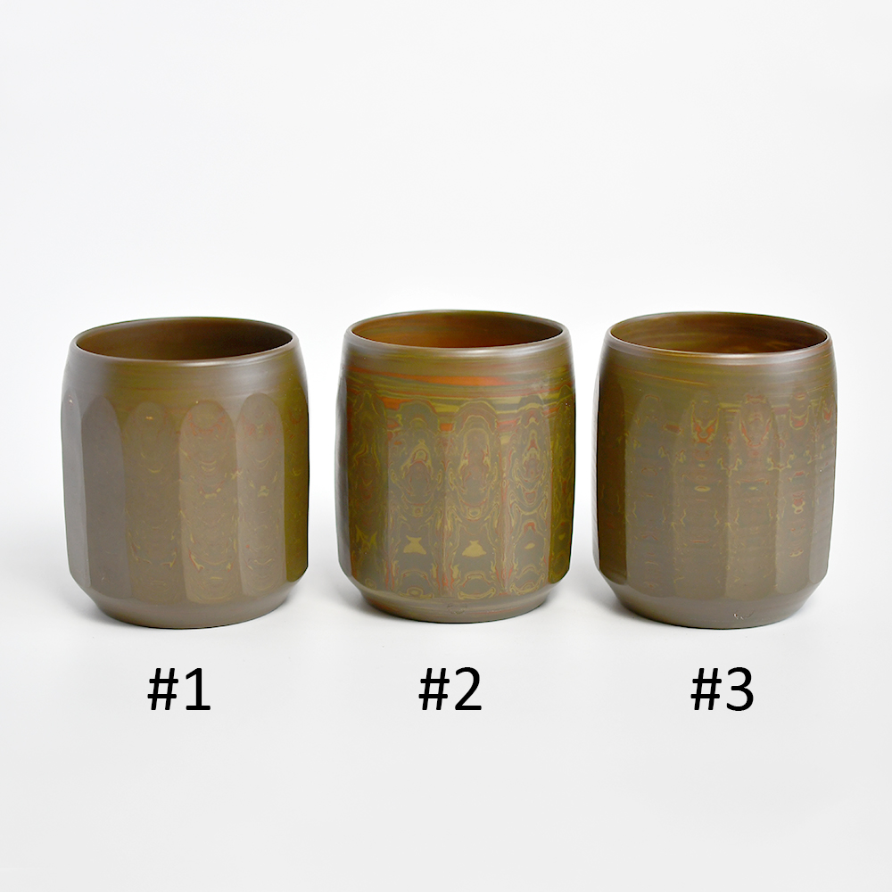 Nerikome is a stunning technique that involves multiple layers of variously-colored clay – it is a classic Tokoname technique that produces a very dramatic effect. These cups feature green, red, and cream colored clay.
