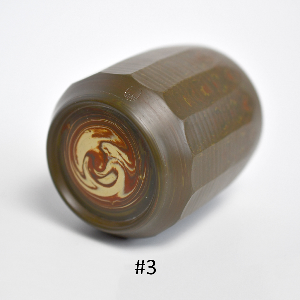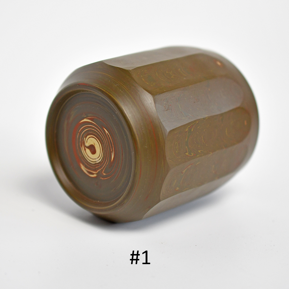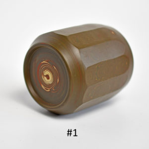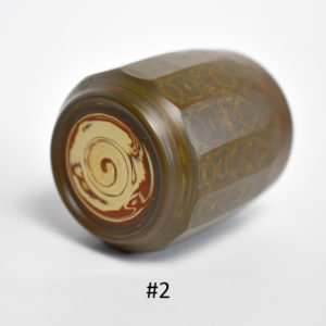 The cups are substantial in diameter, but the angled cuts (and the thin-ness of the clay) make them comfortable in the hand. The inside of the cup has not been faceted – the swirled design of the mixed clay gives the tea drinker a glimpse of what the cup looked like before the cuts were made. The nerikome technique begins with an astonishing marbleized fabrication that is necessary to achieve its stunning overall effect. The foot ring of the cup has been cut back, which adds a bit of flair to the overall aesthetic. Each cup features the mark of the potter.