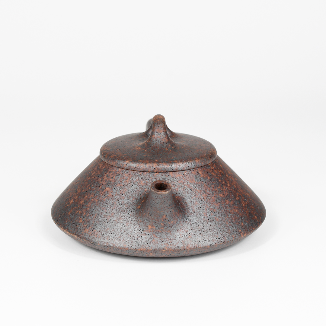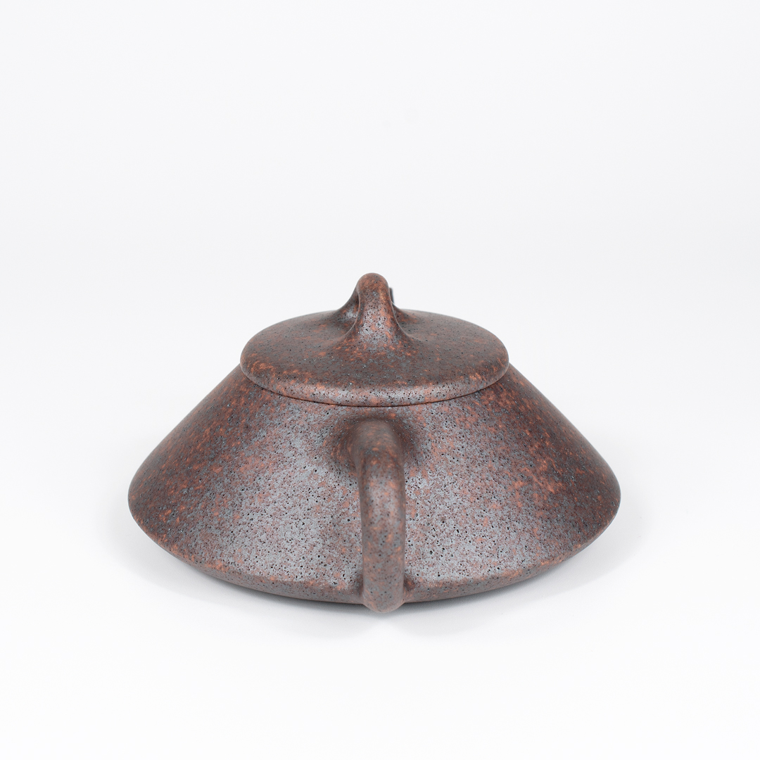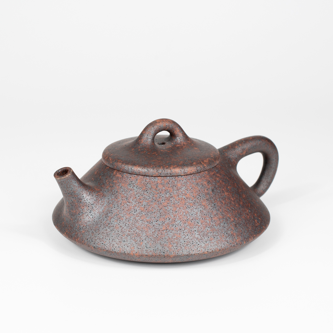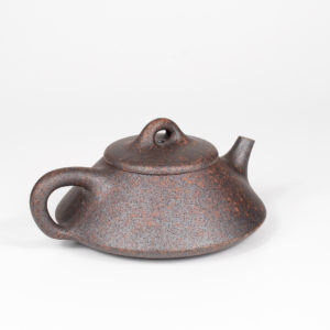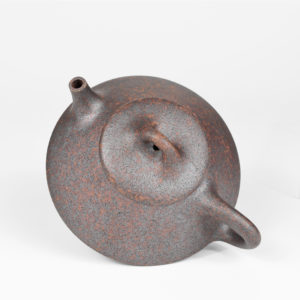 This teapot has a simple, traditional form which gives it confidence and elegance. The clay is a mottled mixture of reddish brown and dark grey colors, with the dark grey portions having an almost metallic sheen. The entire pot is covered in what at first glance appears to be numerous black specks. After closer inspection, you’ll notice the black dots are actually tiny air holes in the clay. Despite the presence of these holes, the surface is very smooth. The pot is highly porous and very lightweight. It is well-made with a tight fitting lid, well-shaped body, and a fast pour. Wang De Ming has signed the pot in three places: the bottom of the pot, base of the handle, and on the inside wall. All in all, a classically-shaped, artisan-made Yixing teapot in a distinctive color that would serve as a great addition to your collection.