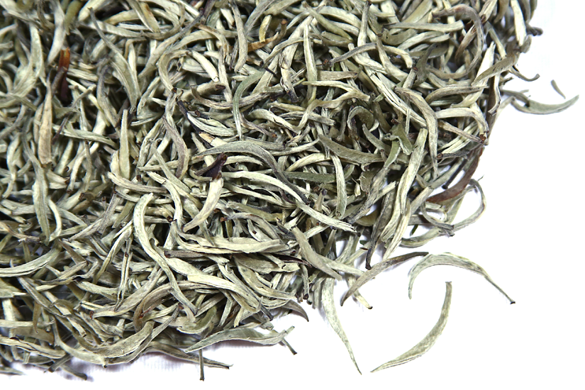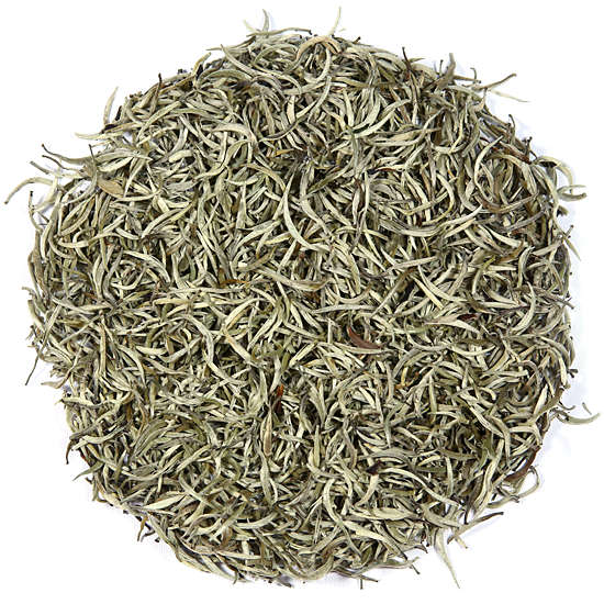 And, in this case, in addition to being manufactured into both black and white teas, the Camellia taliensis leaf is also used in some mao cha blends for Pu-erh, too. So the fresh leaf material from this unusual tea bush cultivar is versatile and highly regarded for its sweet, soft nature. In this manufacture, the fresh buds have been used to make our Da Bai Silver Needles white tea. These large buds are greyish-white in color and underscored with a touch of green. This tea has been withered for a short time (slight oxidation) and then dried quickly with warm air. Da Bai White must have supplemental air movement because the buds are too large to air-dry naturally without molding in the sub-tropical climate of Yunnan Province. This gentle treatment allows the buds to retain a nice large size and a fresh, clean flavor.